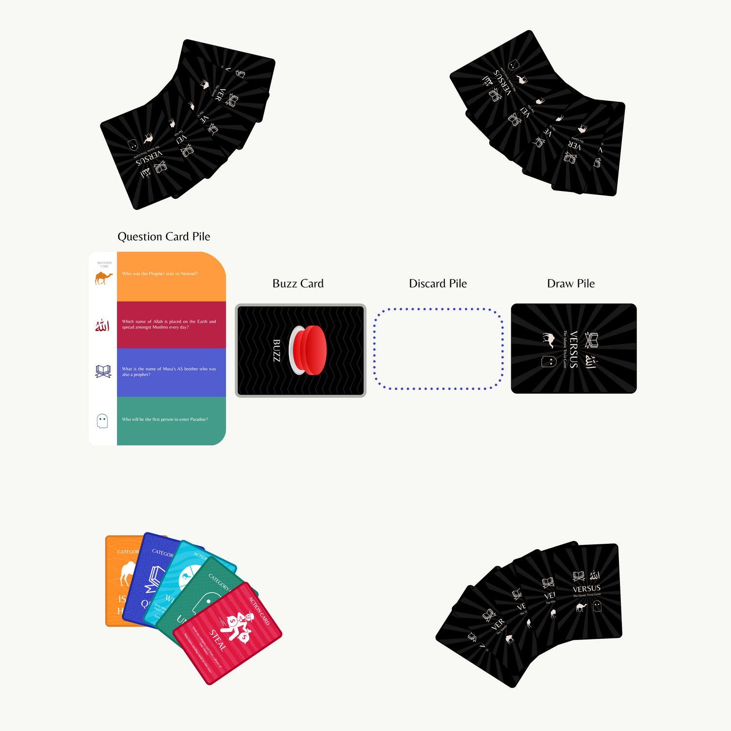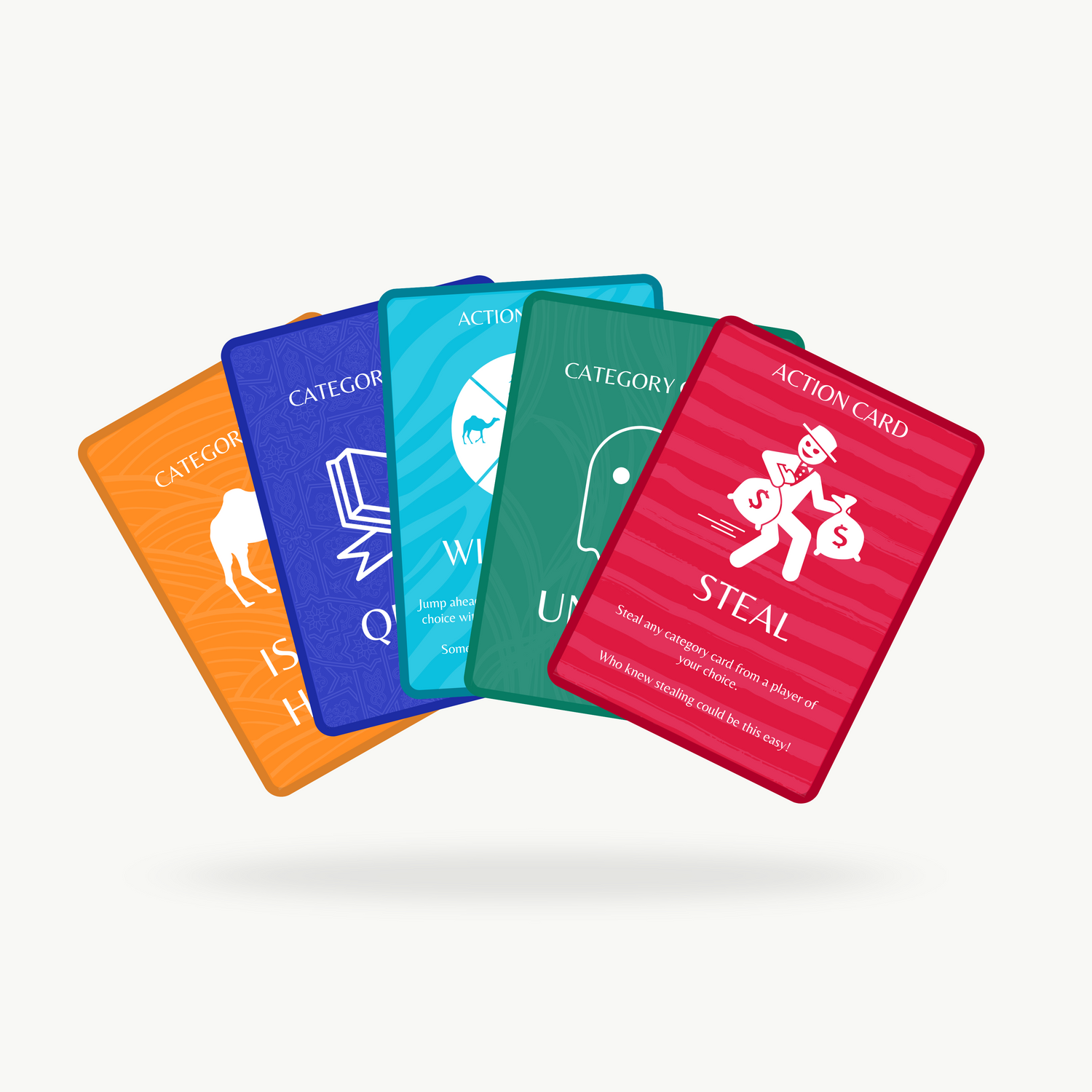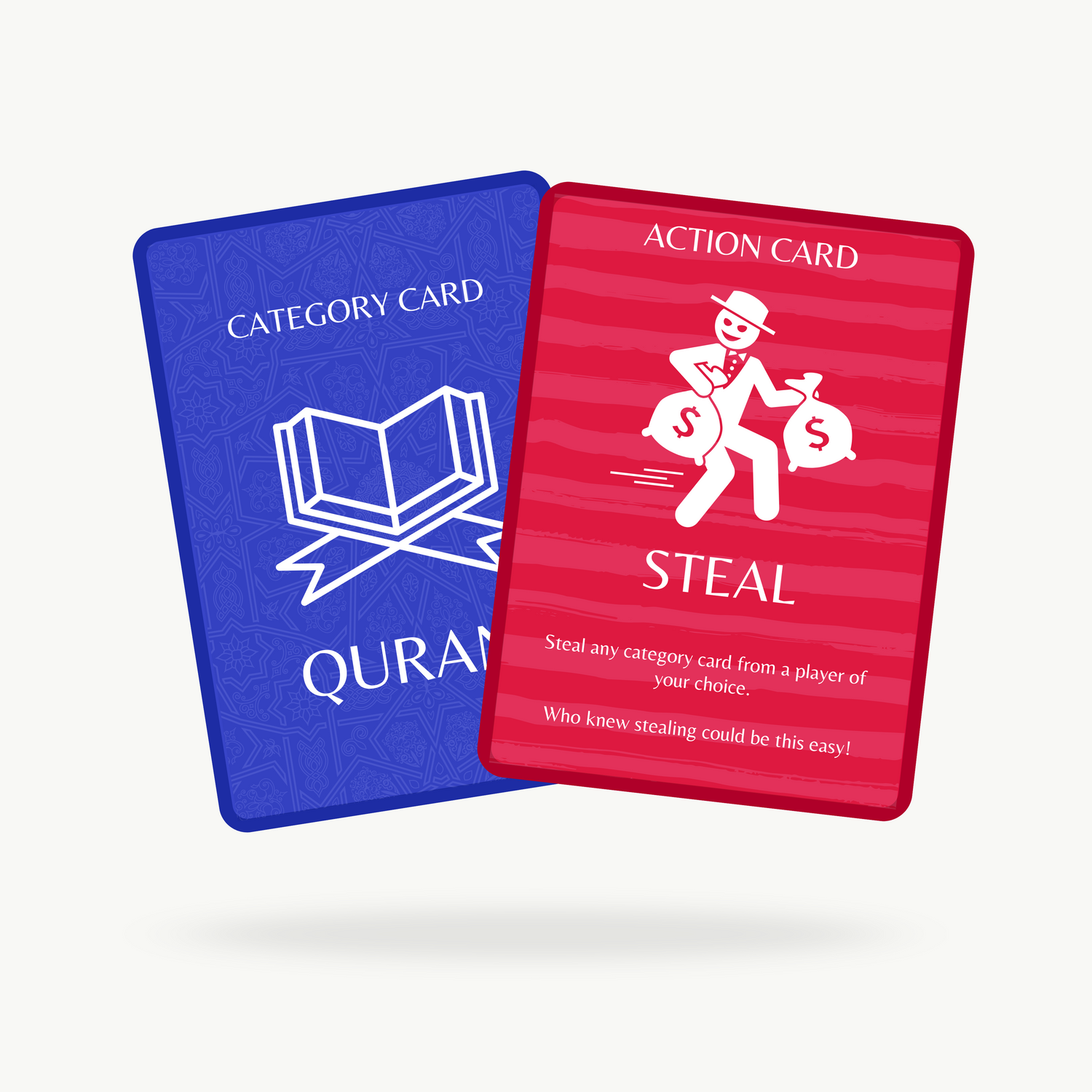 The aim of the game is to be the first player to collect all the category cards: Allah, Quran, Islamic History and Unseen. To win a category card, you need to use your turn to play a category card and then correctly answer the question that corresponds with that category OR play an action card that allows you to acquire a category card.